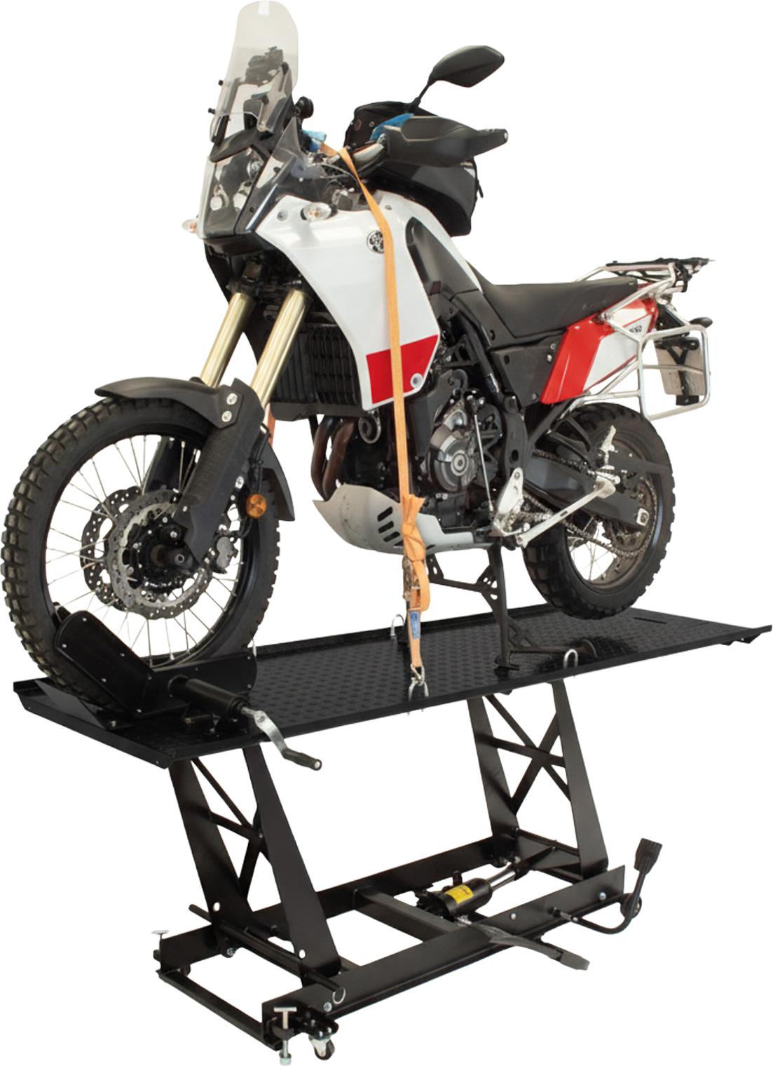 Die Motorradhebebühne ist mit einem praktischen Radspanner ausgestattet, der das Fahrzeug während der Arbeiten sicher fixiert. Die leicht verständliche Bedienungsanleitung in deutscher Sprache sorgt dafür, dass Sie die Hebebühne problemlos in Betrieb nehmen können.
